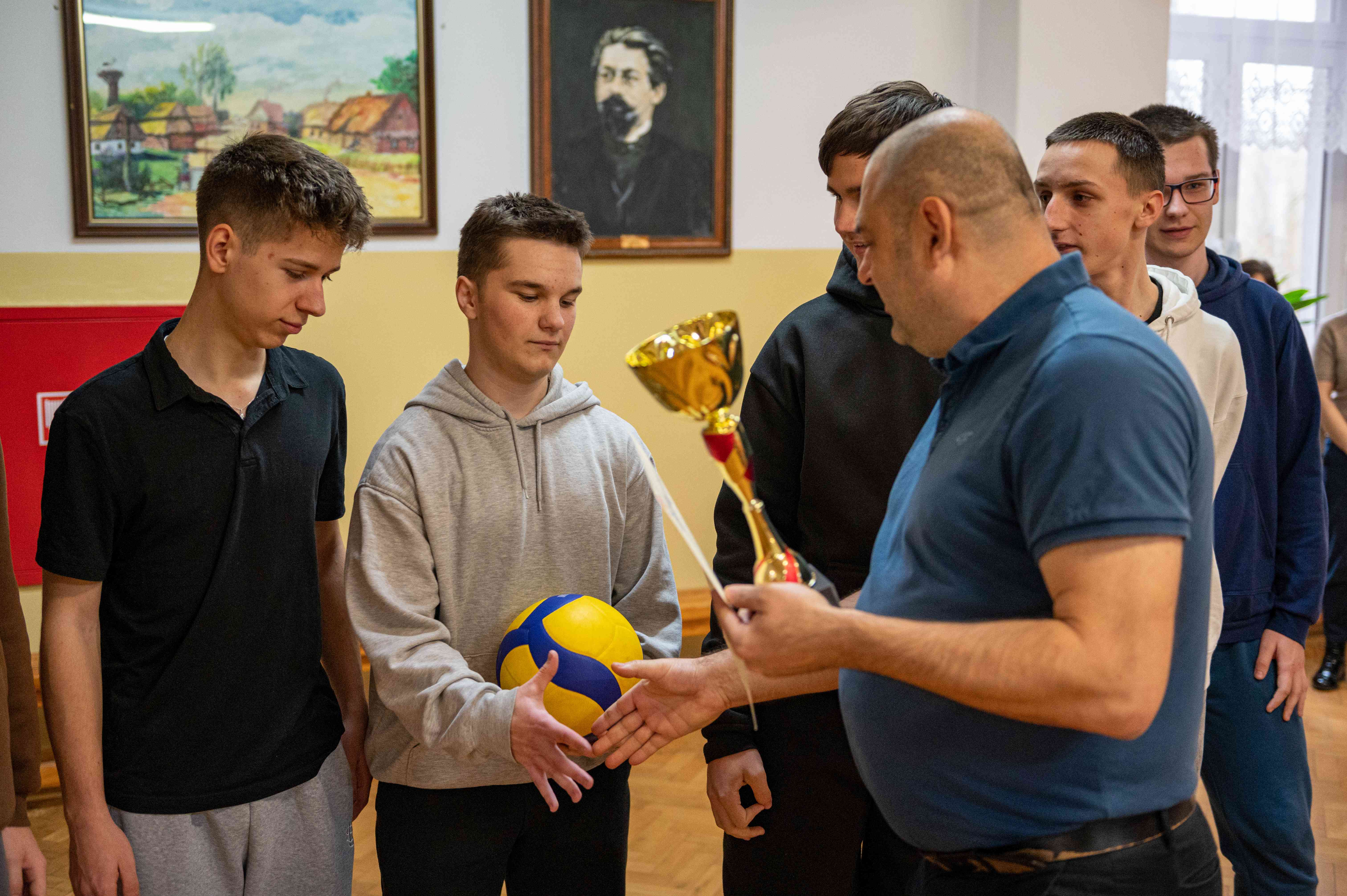 Nagrody, dyplomy i puchar siatkarzom wręczył dyrektor naszej szkoły - Pan Robert Wieczorek.