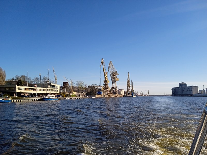 Kolejnym krokiem było przejście przez kontrolę bezpieczeństwa, wstęp na teren portu mają tylko osoby, które posiadają odpowiednie przepustki. Tutaj ukłony w stronę Zarządu Morskich Portów Szczecin i Świnoujście S.A., który takie przepustki wystawił naszej delegacji (nie każdej szkole takie przepustki są wydawane). Następnie mieliśmy okazję odbycia rejsu statkiem Hydrograf-4, służącym do monitorowania głębokości torów wodnych, aby jednostki wpływające do portu nie osiadły na mieliźnie. Rejs rozpoczął się od instruktażu bezpiecznego zachowania na statku i założenia kapoków. Oczywiście jak na prawdziwą lekcję przystało, rejs rozpoczął się od dzwonka oznajmiającego odbicie od brzegu. W tym czasie uczniowie zapoznali się z infrastrukturą nadbrzeżną portu, urządzeniami technicznymi transportu wewnętrznego służącymi do załadunku i wyładunku towarów oraz statkami przebywającymi aktualnie w porcie. W związku z tym, że w porcie obsługiwane są różnego rodzaju ładunki, jest on wyposażony w budowle magazynowe przystosowane do ich przechowywania, takie jak zbiorniki na paliwa ciekłe i gazowe, hale magazynowe, place składowe, czy elewator – największy w Polsce – służący do przechowywania zboża. Nad ruchem w porcie czuwa kapitanat, którego siedziba nie mogła umknąć uwadze uważnie obserwujących otoczenie uczniów. Z pokładu młodzież mogła również obejrzeć statki budowane i remontowane w Stoczni Szczecińskiej oraz wyposażenie w urządzenia transportu wewnętrznego takie jak suwnice bramowe, żurawie stoczniowe.