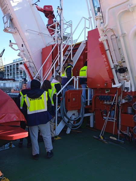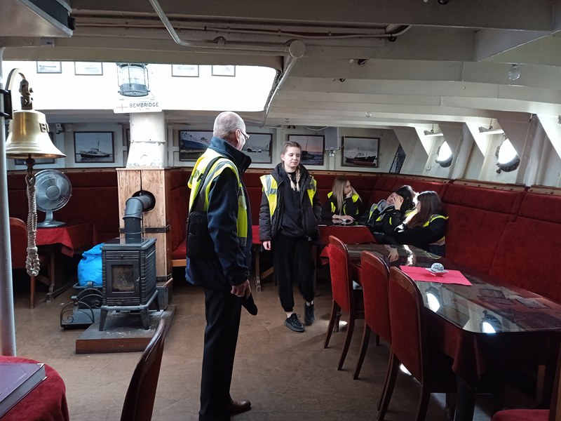 Kolejnym etapem było przejście po nabrzeżu portowym i zapoznanie się z bliska z urządzeniami wykorzystywanymi w porcie do rozładunku i załadunku towarów. Dodatkowo gościliśmy na pokładzie zabytkowego okrętu THPV BEMBRIGE, poznaliśmy jego tajemniczą historię oraz przeznaczenie, gdy pełnił służbę na morzu. Był to statek matka (statek bazowy), na którym przebywali piloci, którzy wprowadzali statki do portu. Do dziś oni pełnią ważną rolę w portach, ponieważ żaden statek nie może wejść do portu bez pilota na pokładzie.