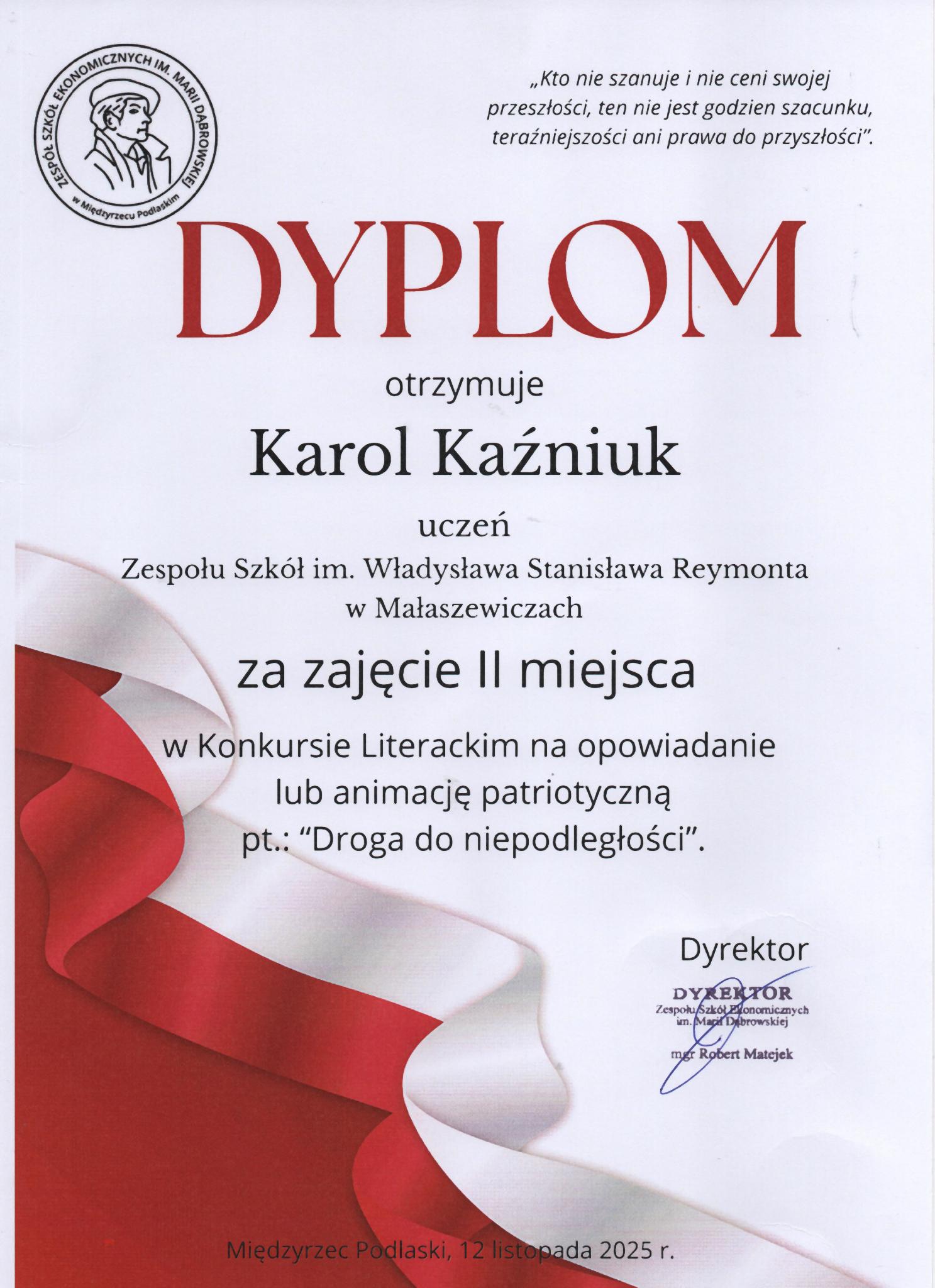 II miejsce Karola Kaźniuka w Konkursie Literackim na opowiadanie pt. „Droga do niepodległości”