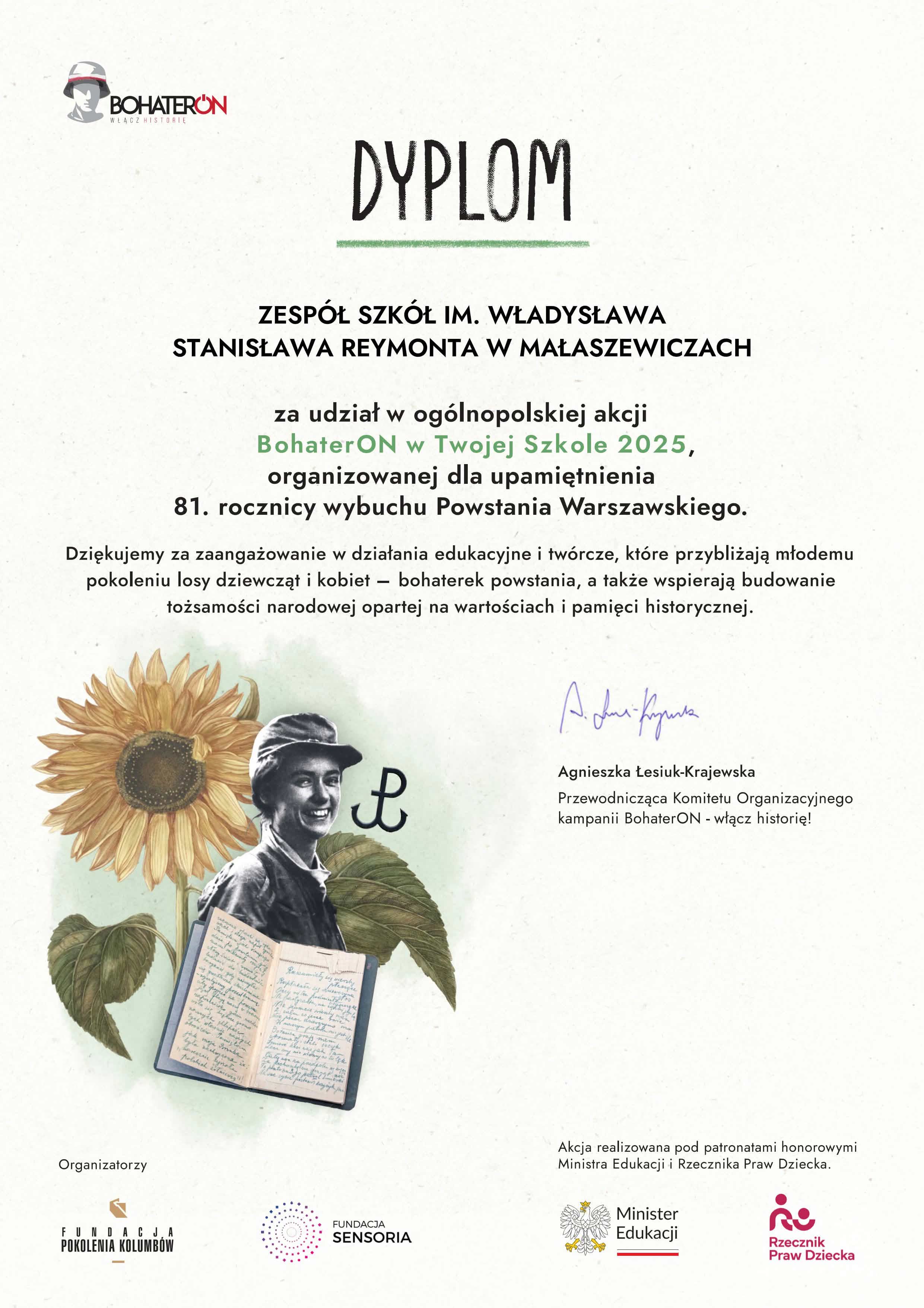 Dyplom za udział w ogólnopolskiej akcji BohaterON w Twojej Szkole 2025