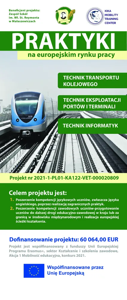 Projekt nr 2021-1-PL01-KA122-VET-000020809 pt. „Praktyki na europejskim rynku pracy”, który jest współfinansowany przez Unię Europejską, w ramach programu Erasmus +, Akcja 1 Mobilność Edukacyjna, sektor Kształcenie i Szkolenia zawodowe dla uczniów i kadry, konkurs 2021
