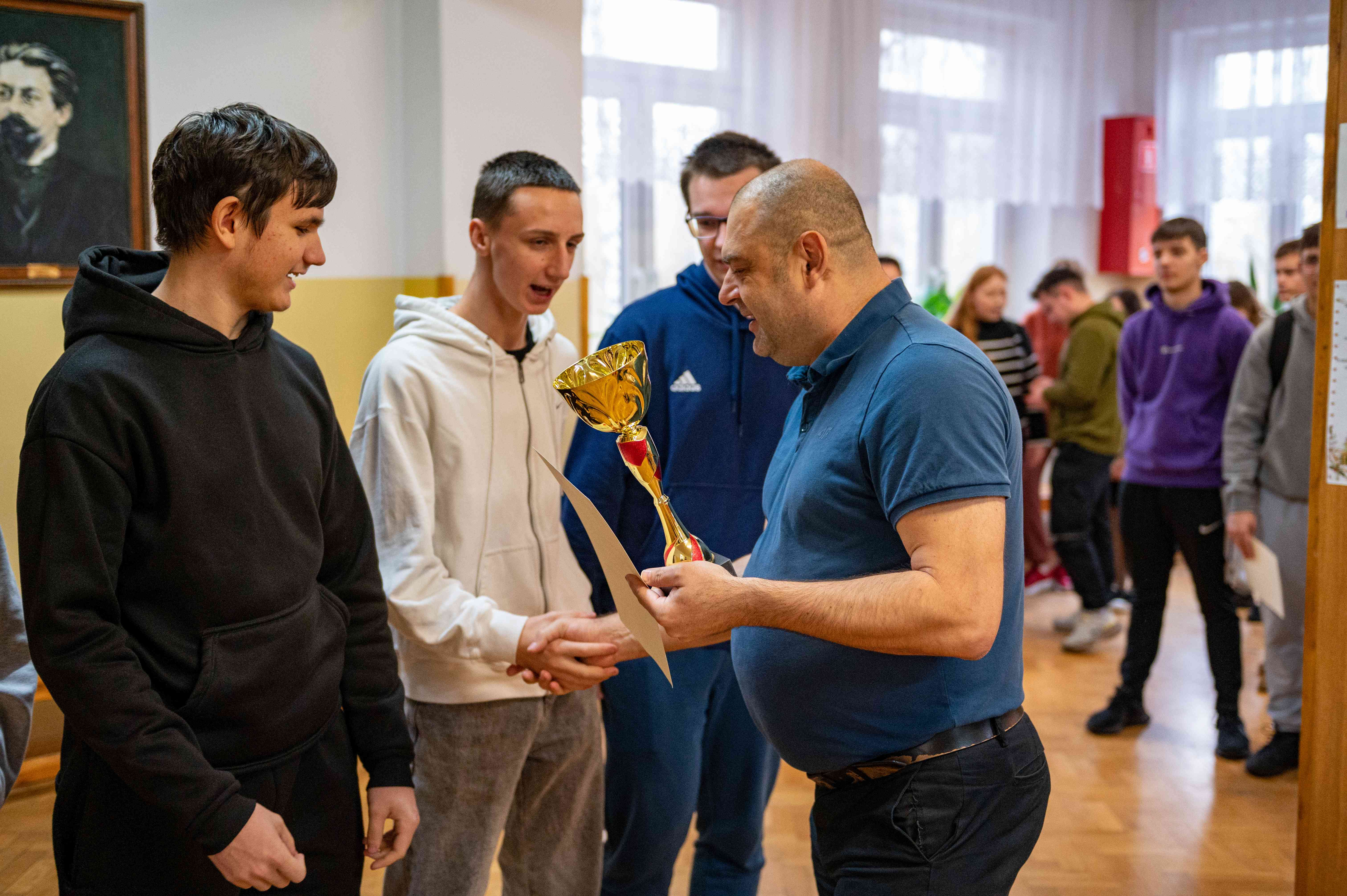 Nagrody, dyplomy i puchar siatkarzom wręczył dyrektor naszej szkoły - Pan Robert Wieczorek.