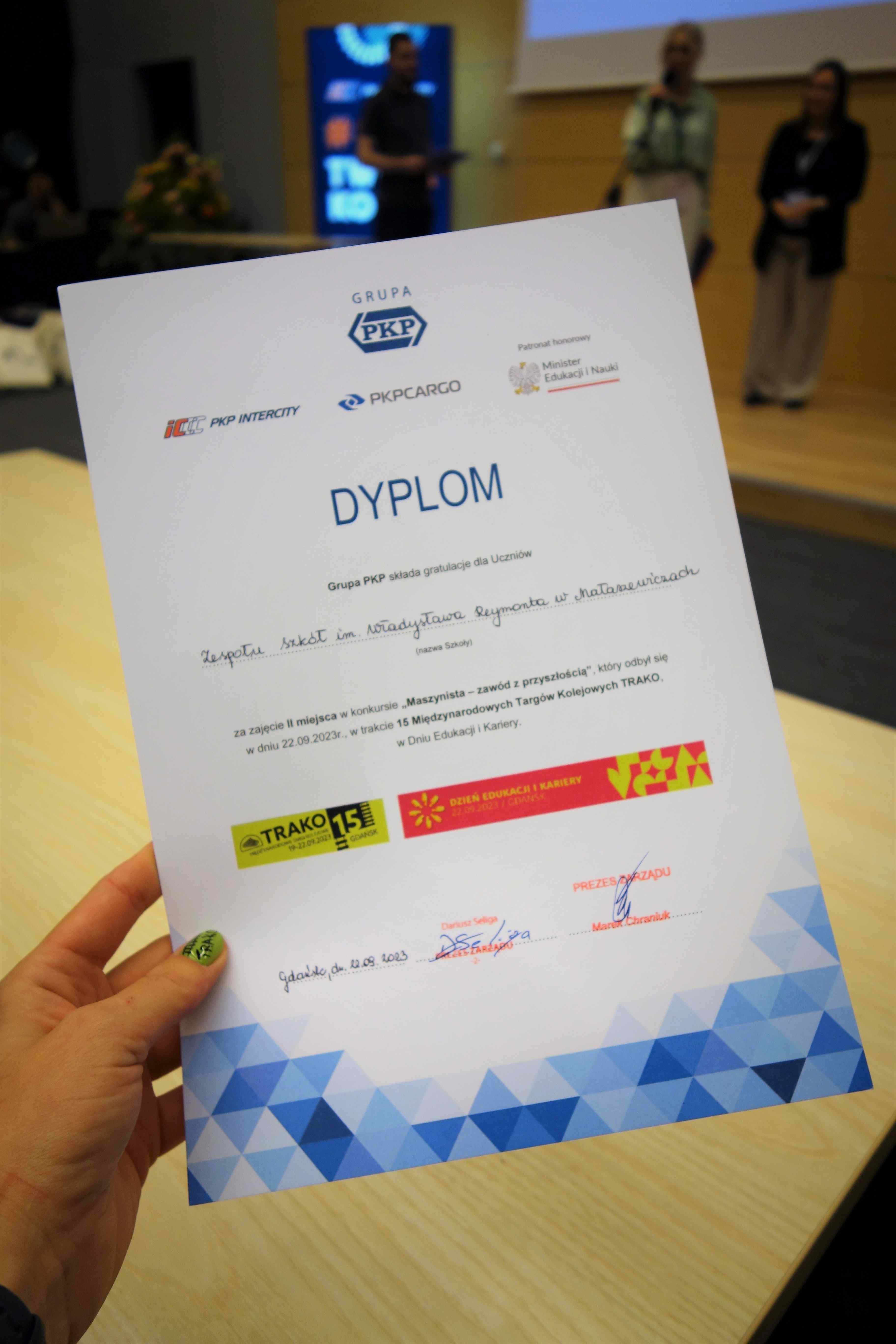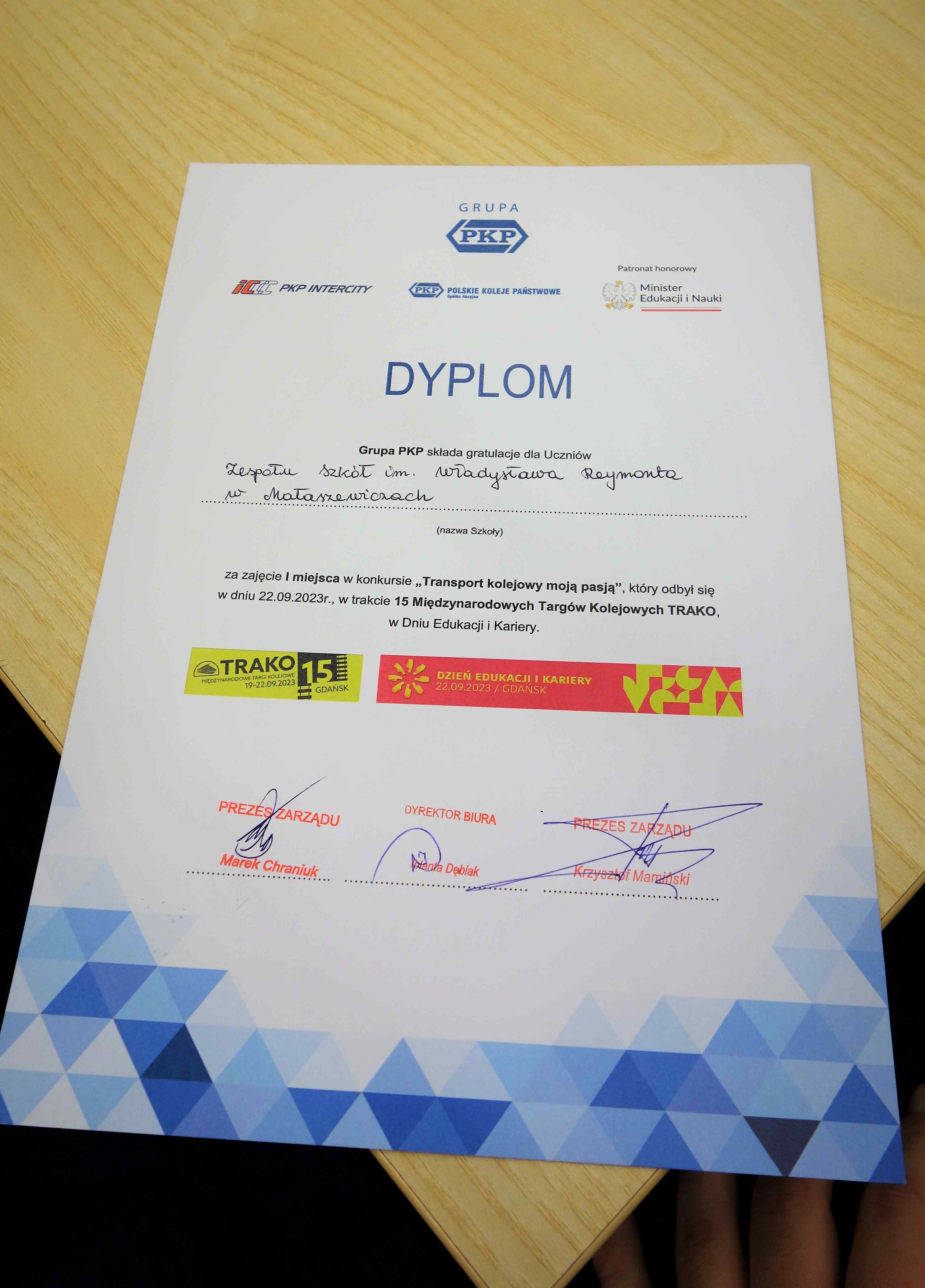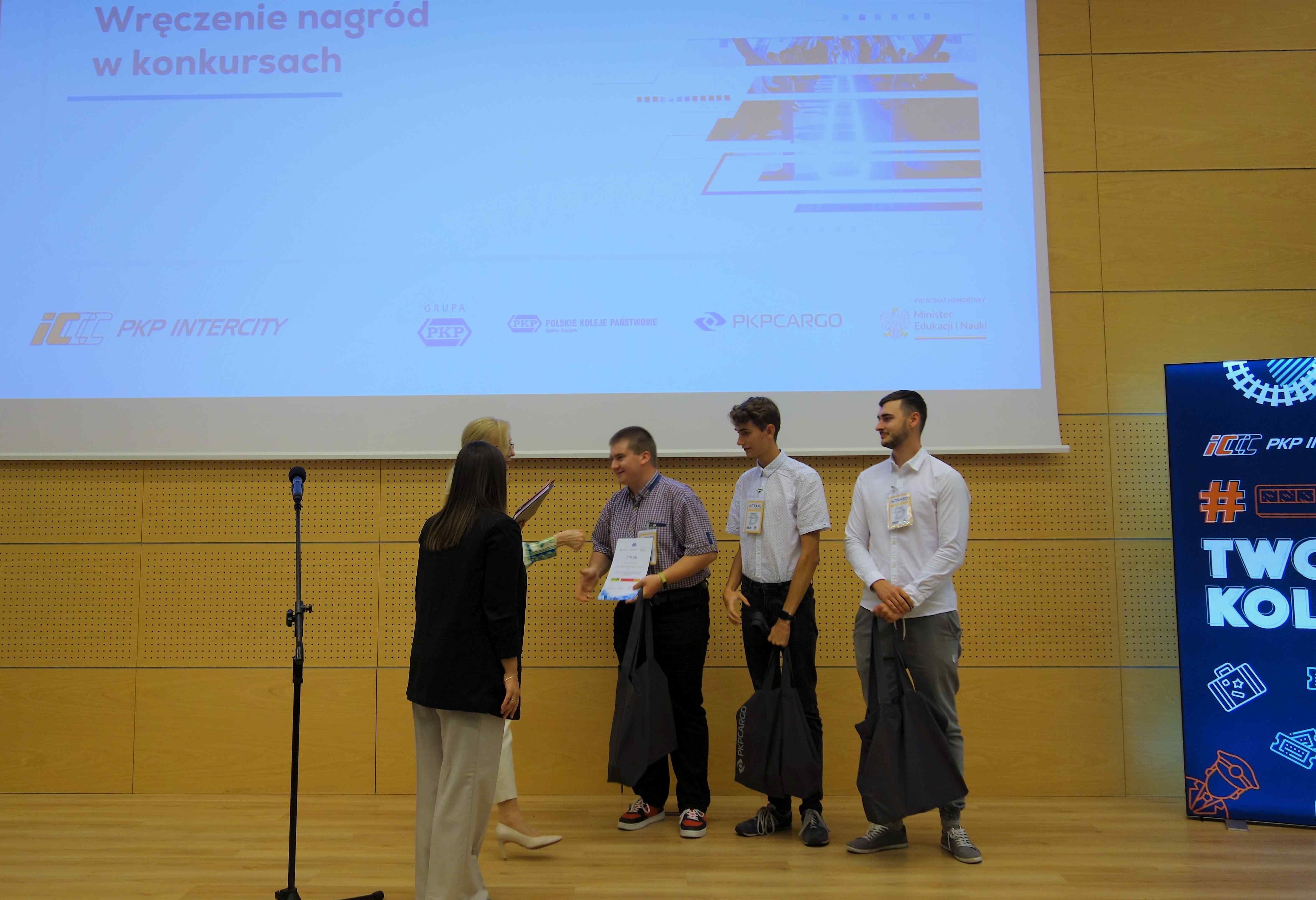 W drugim konkursie „Maszynista – zawód z przyszłością”, w którym brało udział 15 drużyn ze szkół kolejowych z całej Polski, nasz team w składzie: Szymon Kiryczyński (II FI), Jakub Chwesiuk (V DC) i Dariusz Mincewicz (V DI) uplasował się na wysokim drugim miejscu podium! To, czego dokonali nasi uczniowie, to absolutny majstersztyk oraz potwierdzenie tezy, że nasza szkoła – Zespół Szkół im. Władysława Stanisława Reymonta w Małaszewiczach to niewątpliwie jedna z najlepszych – jeśli nie najlepsza szkoła kształcąca w zawodach kolejowych w Polsce! Żadna inna placówka nie osiągnęła aż tak dobrego wyniku w tych ogólnopolskich rywalizacjach. Możemy tylko dodać, że pękamy z dumy i podziwu. Serdecznie gratulujemy fantastycznego wyniku, życząc jednocześnie jeszcze więcej tak wspaniałych sukcesów!
